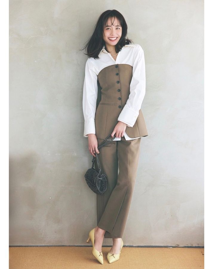 4月7日(火)、スタンダードな白シャツも、セットアップのビスチェを重ねるだけで一気に華やかな印象に。すっきりとしたシルエットで大人っぽく仕上げつつ、レイヤードで洒落感がプラスされて見えます。白×ブラウンの上品な配色に、イエローパンプスで春らしい差し色を効かせて。きれいめとトレンドをバランスよく取り入れた、オケージョンにも対応できる着こなしです。