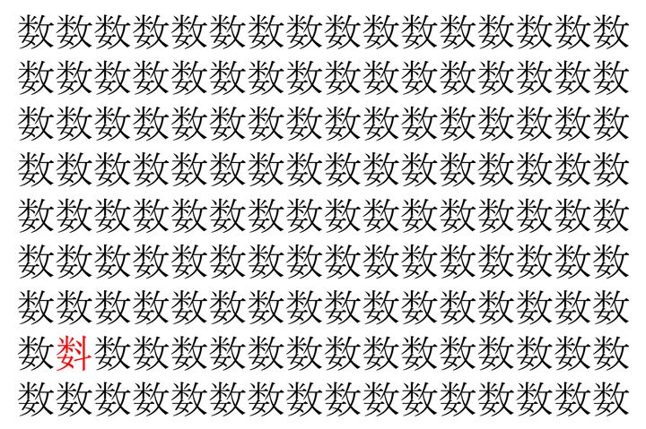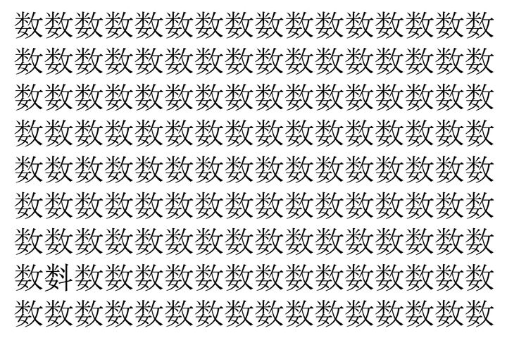 画像の中には、「数」という漢字が縦に9行、横に16個並んでいます。 全部で144個となりますが・・・、そのうち1つは「異なる漢字」となってますよ!!