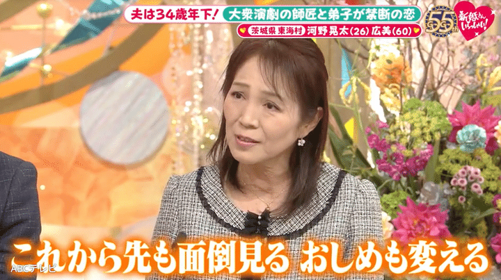 4月5日放送の『新婚さんいらっしゃい!』に、夫・26歳、妻・60歳という新婚さんが登場。茨城県東海村で34歳差の愛を育むカップルだ。