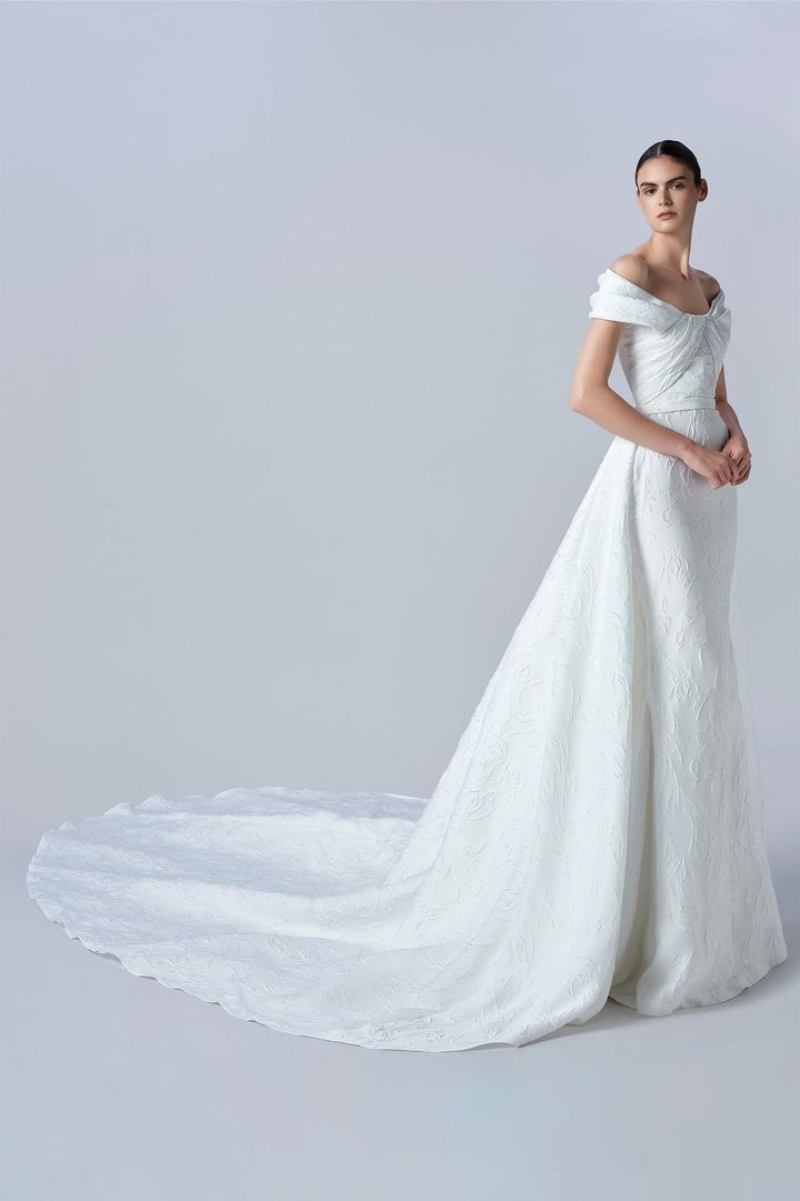 エンボス加工のような技法により、フラワーパターンを浮かび上がらせた独特の素材感が魅力。胸もとのギャザリングやボリュームのあるトレーンなど、エリー・サーブらしい洗練されたデザインです。ドレス¥880,000[レンタル価格](エリー・サーブ/ジュノ tel.050-1791-4488)