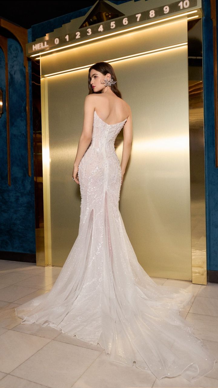 高感度な花嫁から絶大な人気を誇るガリア・ラハヴ。極上の素材を使用した、繊細かつドラマチックなドレスづくりは健在です。マーメイドのシルエット&シャープなトレーンがゲストを魅了! ドレス¥715,000[レンタル価格](ガリア・ラハヴ/マグノリア・ホワイト 表参道 tel.03-6434-1313)