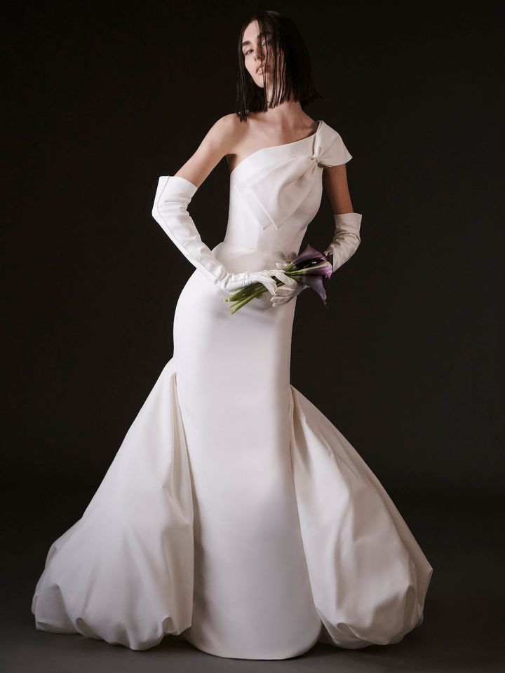 プロノビアスはヴェラ・ウォンとのコラボレーションラインのレンタルをスタート。スリムなラインやワンショルダーのデザインがモダンな雰囲気。胸もとに大きなリボンとバルーントレーンを加えて、少し甘さをプラスしています。ドレス¥572,000[レンタル価格](ヴェラ・ウォン ブライド フォー プロノビアス/プロノビアス アオヤマ tel.03-3498-0040)