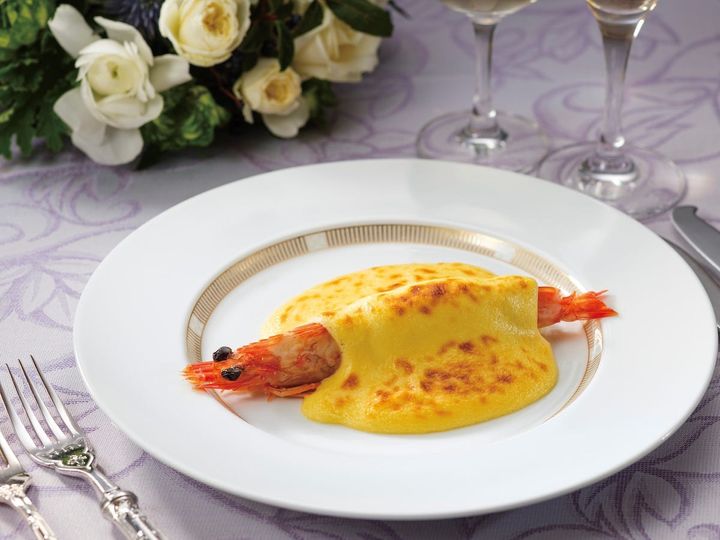 1975年に英国のエリザベス女王が来日した際、「帝国ホテル 東京」で開かれた午餐会のために、当時の村上信夫料理長が考案。魚介類が好きだった女王は大変気に入り、自分の名前を冠することを許しました。それが写真の「海老と舌平目のグラタン“エリザベス女王”風」。別名「レーンヌ・エリザベス」として愛され続けている一品です。