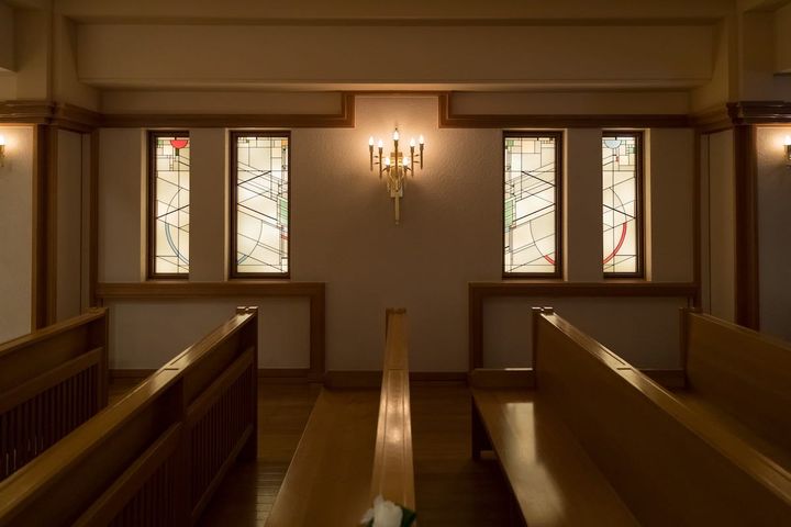 チャペルの側面にもフランク・ロイド・ライトのデザインを取り入れたステンドグラスが飾られています。キリスト教式では着席で最大80名までの列席が叶い、多くのゲストに誓いのひとときを見守ってもらえるのが嬉しい。