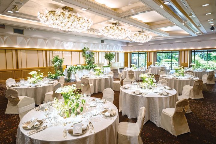 大きな窓からは庭園の緑が見渡せる、上品でナチュラルな空間。シャンデリアや絨毯には桜がモチーフとしてデザインされており、とても華やか。着席で最大137名までのパーティが叶います。