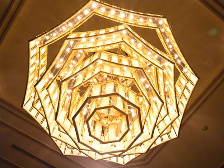 正面ロビーには、“ゴールデンローズ”と名付けられたシャンデリアが輝いています。金色のバラをイメージしたこのシャンデリアは、ホテルのロビーに美しく咲いてほしいという、制作者である多田美波氏の思いが込められたもの。368枚の淡黄色のガラス板によってつくられ、その温かな光でメインロビーを照らし続けています。