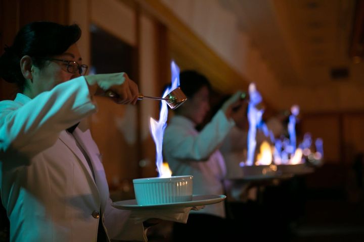 ホテル開業時から培われてきたスタッフのサービス力は、ウエディングのプランニングをはじめ、当日のパーティでも垣間見ることができます。例えば温かいダークチェリーのソースを冷たいバニラアイスクリームにかけた「チェリージュビレ」は会場内でのフランベ演出がある人気のメニュー。テーブル担当ひとりひとりが手もとで炎を扱う技量をもっています。