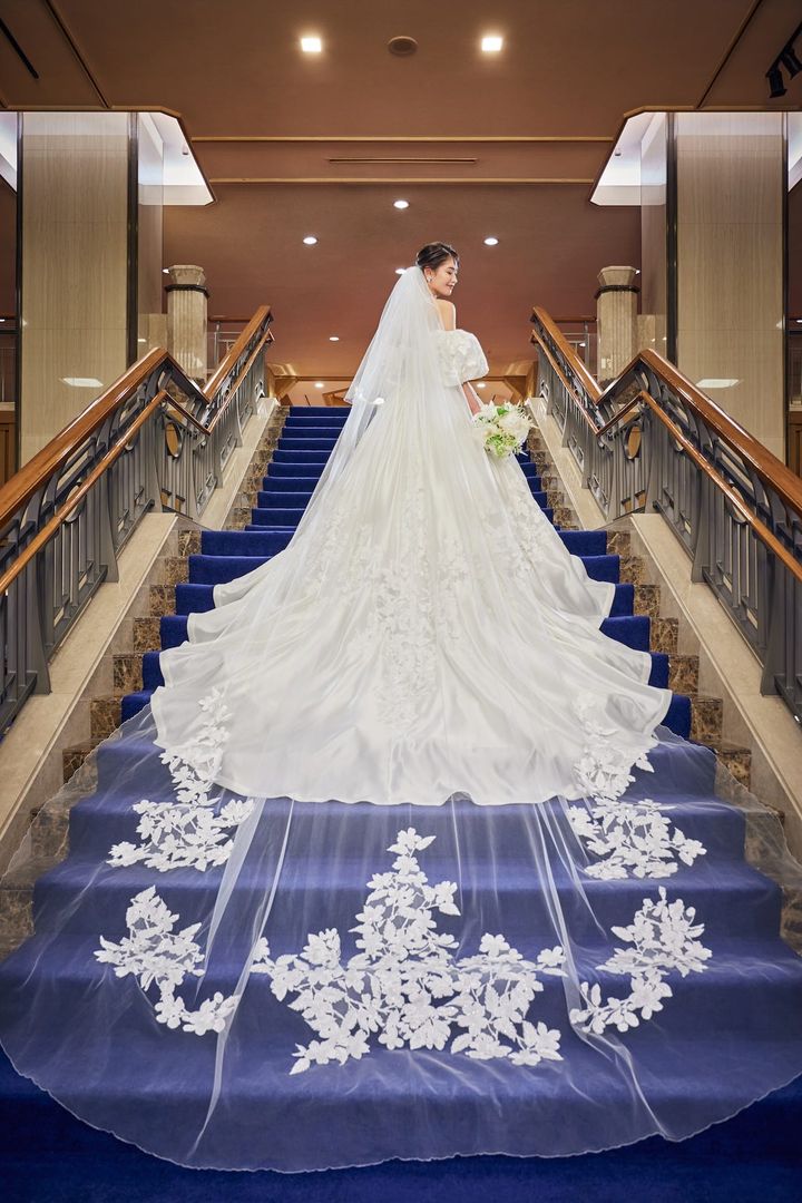 正面ロビーにある大階段は、美しいブルーが印象的。トレーンやベールを長く引くスタイルなら、階段に美しい衣装が映えてとてもフォトジェニック!