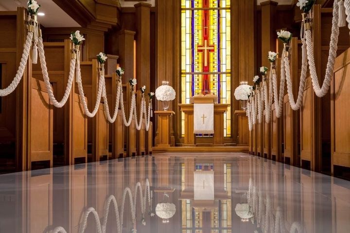 チャペル内には20世紀を代表する建築家、フランク・ロイド・ライトのデザインをモチーフとしたステンドグラスが飾られています。真っ白な大理石のバージン・ロードにふたりの姿が映るさまは、とてもロマンチックでドレスのフォトスポットとしても人気です。