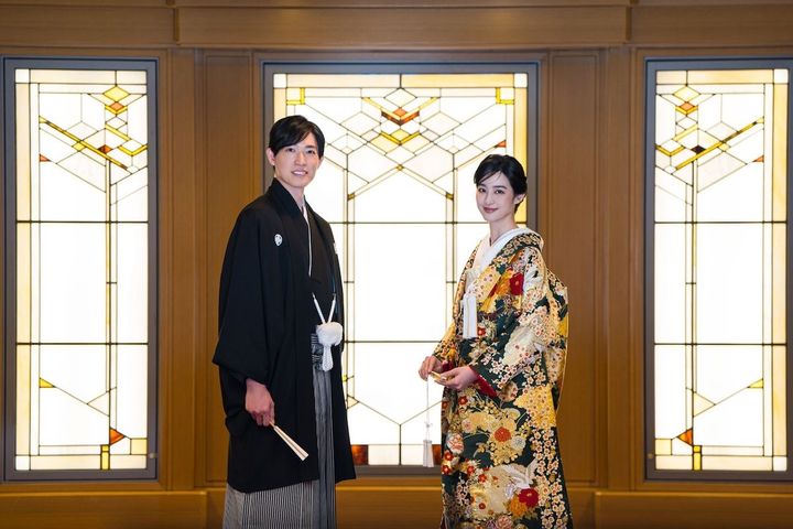 館内にはフランク・ロイド・ライトのデザインをモチーフにしたステンドグラスが配されていますが、このモダンなインテリアは和装撮影にも人気。撮影プランは前撮り、後撮りのほか挙式のみのプランと組み合わせるなどさまざまに対応しています。