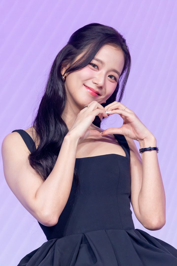 2025年1月7日、韓国・ソウルのホテルで行われた主演ドラマ『ニュートピア』の記者会見に、鮮やかなパープルのハーフスリーブワンピースで出席したジス。ディオールのベルトがアイキャッチになっています。