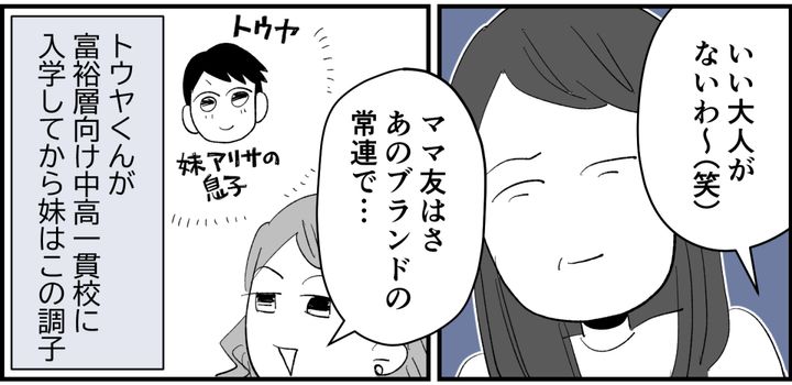 昔は仲が良かった妹のアリサですが、甥っ子のトウヤくんがセレブ校に入ったことですっかり別人のようになってしまいました。