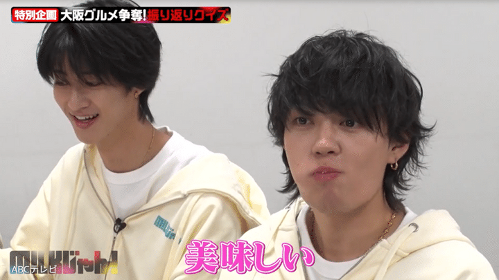 吉田は、いつのまにか空になった皿を見て「え、なくなった! なんで!?」と大騒ぎ。塩﨑太智に爆笑され、同じく笑う山中柔太朗に「(食べるの)早いね」と追い打ちをかけられ、食べてないコルネの感想をなぜか佐野に求められ、「たしかにめっちゃおいしいわ……」と捻り出した。