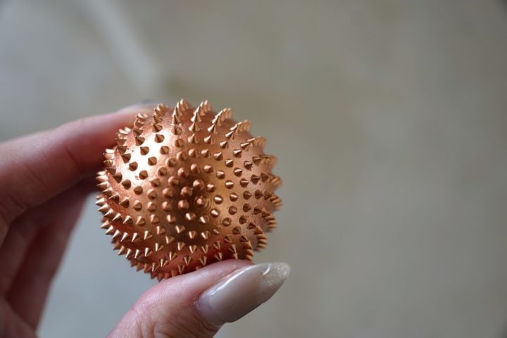 どちらも手のひらに収まるサイズ感ですが、オリジナルサイズは程よい重みがあり、肩回りや足裏に転がして使いたい大きさです。よく見るとそれぞれのスパイクの大きさが異なっており、固くなった体をしっかりと刺激することができます。