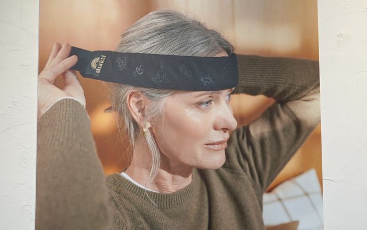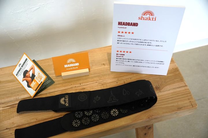 従来のマットだけではアプローチしづらかった「頭」を刺激できるヘッドバンドは、シャクティらしい異国調の模様が印象的でシックなデザイン。