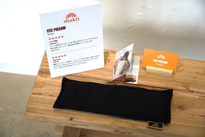 こちらのアイテムにはスパイクはついておらず、中に天然クレイビーズが入ったオーガニックコットンが目元を優しくプッシュします。一般のアイピローだと目を閉じて視界を遮断すると、逆に音や他の情報が気になって寝つけないこともありますが、シャクティのアイピローはずっしりとした重みに集中でき、意識が自然と内側に向いていきます。