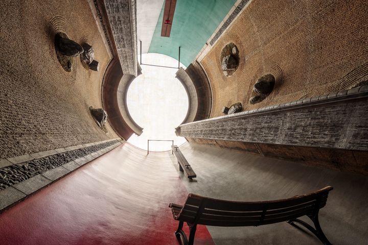 完成したのは、8枚のHPシェル(曲面壁)が空に向かってそびえる、荘厳なコンクリートの聖域。この四角形の対角線に沿って立てられたシェルは、上空からは十字架に見える。また、これはトップライトとしても機能し、聖堂内で上を向くと、光の十字架が浮かび上がるのが見える。
