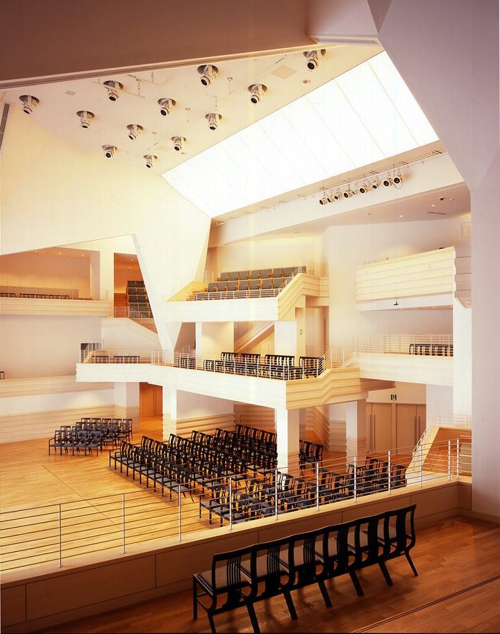 本館棟のホール(写真)は、現代音楽の巨匠、ルイジ・ノーノのオペラ『プロメテオ』を上演することを念頭に設計された。座席は全て可動椅子になっており、何処にでもステージを設けられるような構造になっている。