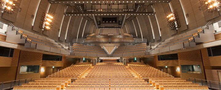 天の川のような照明が内蔵された大ホールの天井の凹凸と壁の竪リブの突起物は、高中音域の反射・拡散の役割を担い、天井と床の重量バランスは音が着実に下に戻るよう考慮されている。