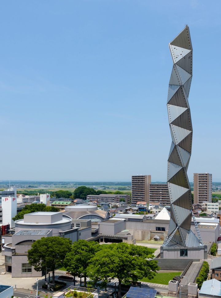 水戸市制100周年を記念し、1990年に開館。コンサートホールATM、ACM劇場、現代美術ギャラリーが入る複合文化施設。そのシンボルは、なんといっても「100周年」にかけ、高さ100mとした塔だ。磯崎はこれについて「正四面体を組合わせることによって、三重螺旋を生みだし、その天に向かって無限に伸びていく形態によって、未来を象徴している」と語っている。チタンを用いた面は、太陽光を浴び、刻々と表情を変える。