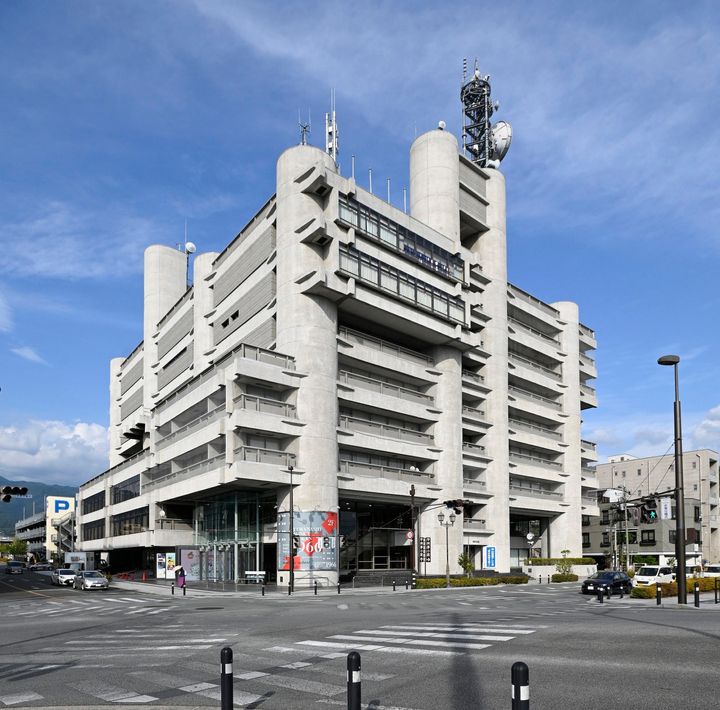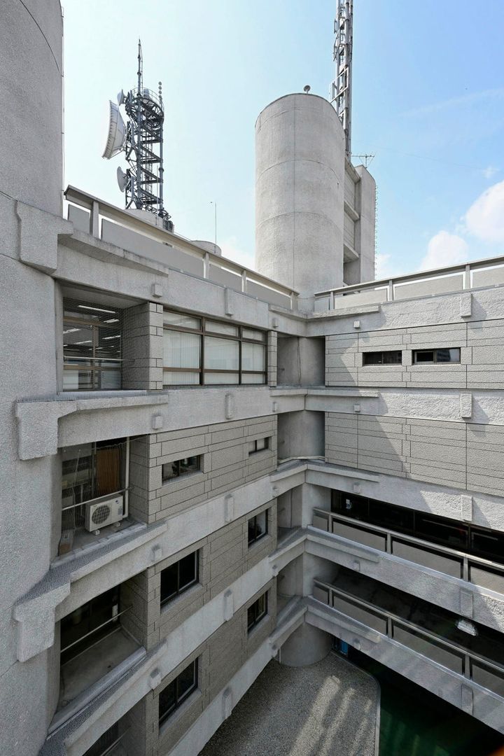 16本の円柱が床スラブを支える、圧巻の地上8階、地下2階のコンクリート建築。1966年に、山日YBSグループの本社として建てられた。丹下は8案もの設計図を描き、「都市のように発展しうる建築」を提案。将来的な技術の変化や事業の拡大に応じて増築や改修ができるよう、「余白」を用意した。このもくろみ通り、1974年には大規模な拡張工事が実施され、北東部分の6、7、8階、南東部分の5、6、8階を増築した。