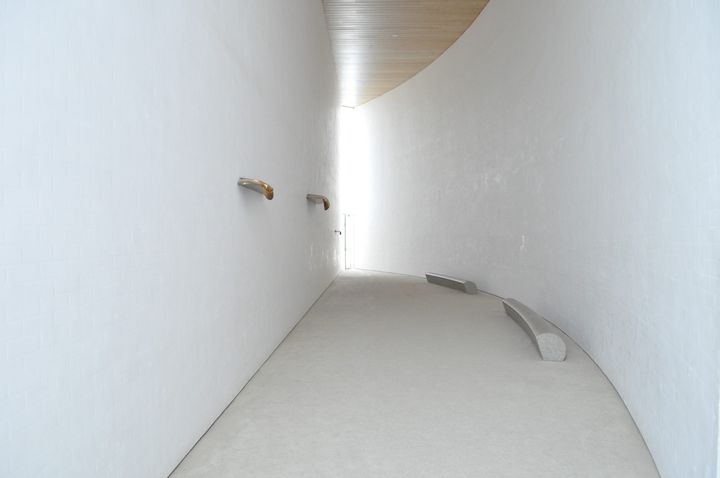 敷地内でも目を引く丸い断面をもつ円筒形の建物は「太陽」。この中には、荒川修作+マドリン・ギンズの作品《遍在の場・奈義の龍安寺・建築する身体》の世界が広がる。半月型の「月」には、岡崎和郎が手掛けた《HISASHI-補遺するもの》が恒久展示されている。また、「大地」は、宮脇愛子によるステンレスワイヤーの作品のための空間だ。