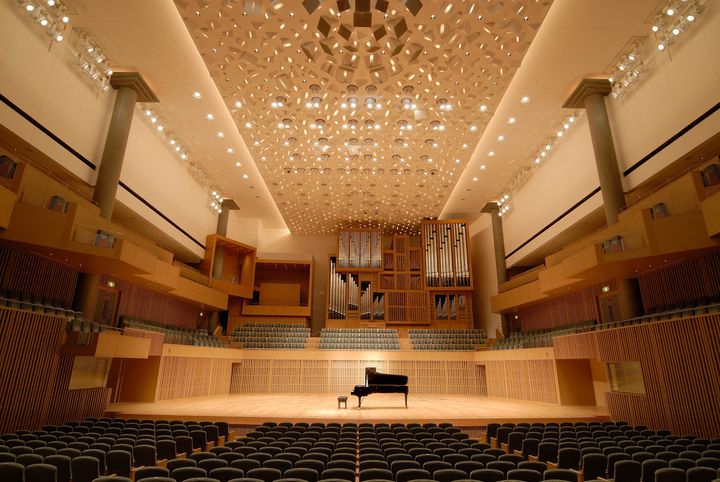 <写真>大ホールでは、オーケストラの音源の非対称性などを考慮し、ドイツ製パイプオルガンと一部の客席を非対称に配置している。