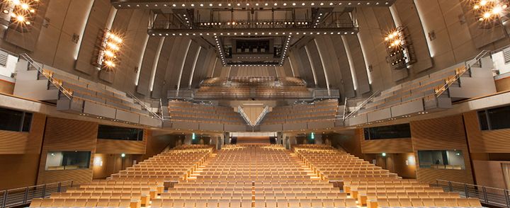 天の川のような照明が内蔵された大ホールの天井の凹凸と壁の竪リブの突起物は、高中音域の反射・拡散の役割を担い、天井と床の重量バランスは音が着実に下に戻るよう考慮されている。