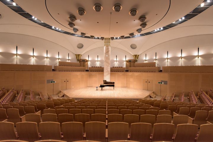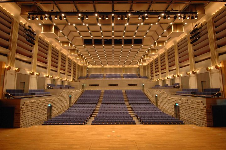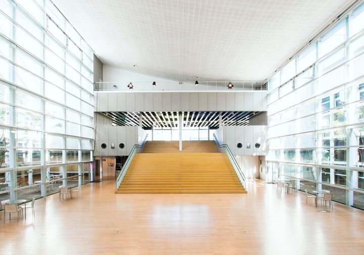 本館棟のホール(写真)は、現代音楽の巨匠、ルイジ・ノーノのオペラ『プロメテオ』を上演することを念頭に設計された。座席は全て可動椅子になっており、何処にでもステージを設けられるような構造になっている。