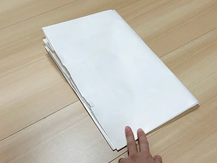 取っ手部分を切ったら、紙袋を半分に折って折り目をつけます。
