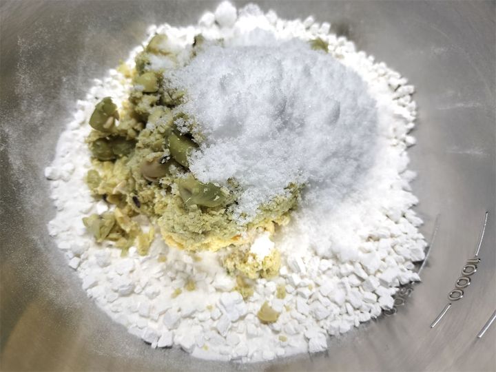 レシピを検索すると、もっと鮮やかな緑色の豆しとぎが出てくるのですが、豆と粉の分量を調整しないとあの色はおそらく出ない気がします。かといって豆ばかり増やしてしまうとおそらく成形に困ることになりますので、加減は必要ですね。