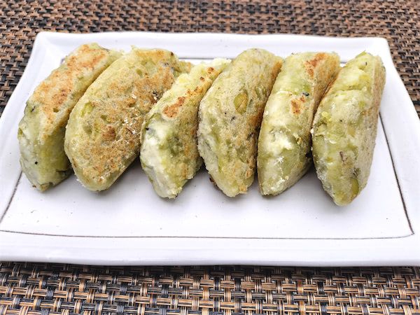 豆は茹でていますが、米粉ともち粉は生のままです。消化不良をおこしたりしないのでしょうか…。記事に「油をひいたフライパンで両面に焼き目をつけたもの」と、「油でこんがり揚げた」食べ方が紹介されていたので、フライパンで弱火で焼いてみることにしました。