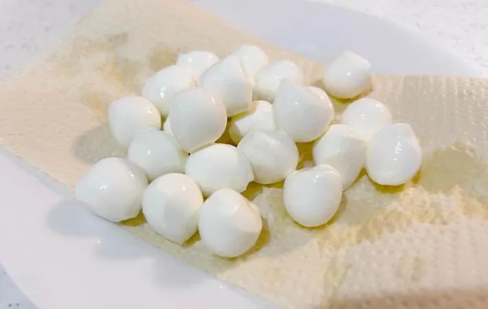 モッツァレラチーズをザルにあけ、水分をしっかりと切ります。