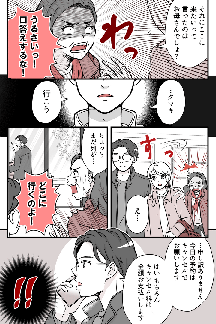 母はイライラが募り、ついに私やヨウタに怒鳴り散らしたのです。母の暴言が出た瞬間、ヨウタは迷いなく「帰ろう」と立ち上がり、なんと宿の予約を即キャンセル! パニックになって叫ぶ母に一瞥もくれることもなく、「ルールを破ったから帰る」と告げてタクシーを呼びました。