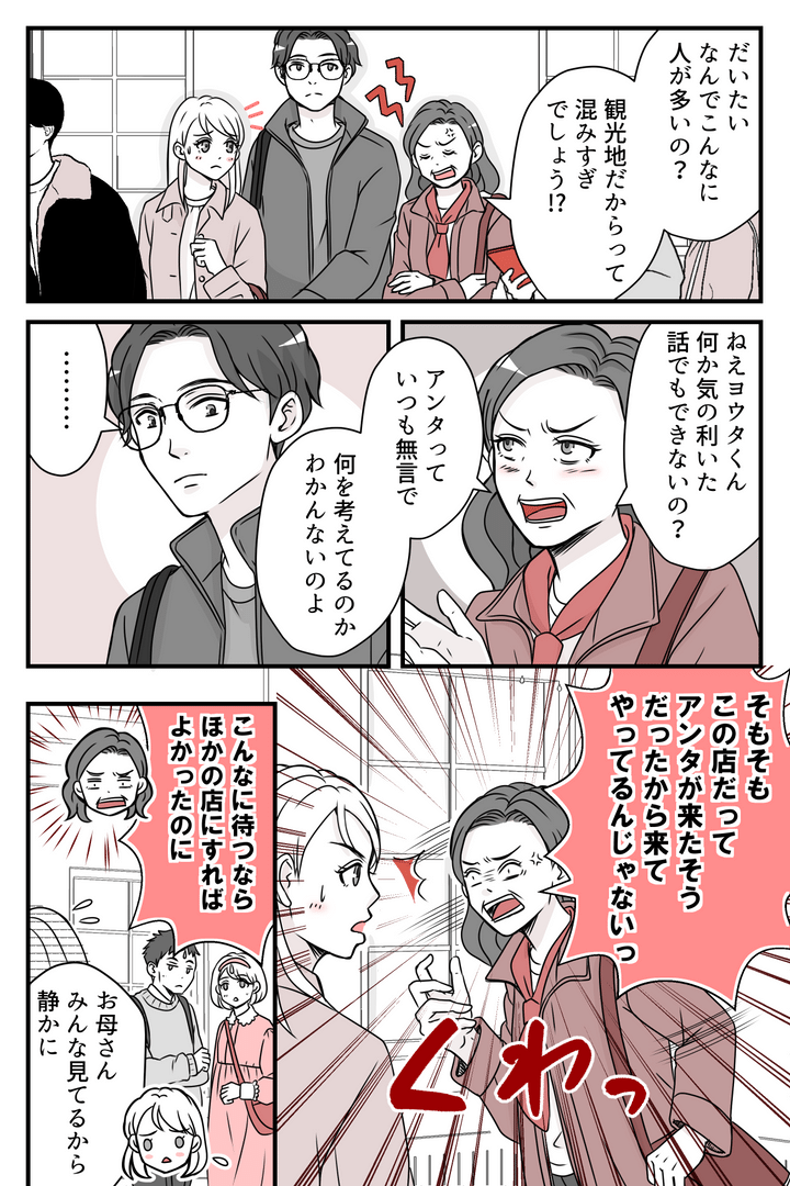 母の希望で、観光地付近のカフェにやってきましたが、情報通りの激混みです。母は予想以上の混雑と待ち時間にだんだんとイライラしはじめました。そうこうしているうちに、母の視線は、目の前で無言で立っているヨウタに向かいます。ヨウタは静かに母を見つめますが、口は開きません。イライラした母は矛先を私に変えました。