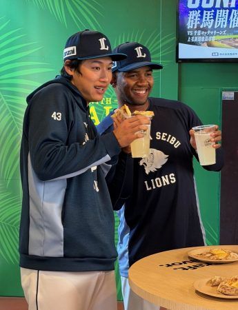 この日は、地元・所沢出身の剛腕サウスポー羽田慎之介投手と、ドミニカ出身のE・ラミレス投手が試食! 「めっちゃおいしいです!!」と大絶賛でした。