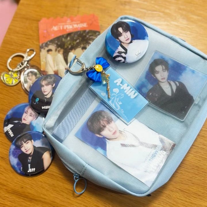 正面は、程よい透け感のメッシュポケット仕様で、さりげなく推しをディスプレイできます。アクスタや缶バッジなどを飾れば、即“推し活ポーチ”が完成!
