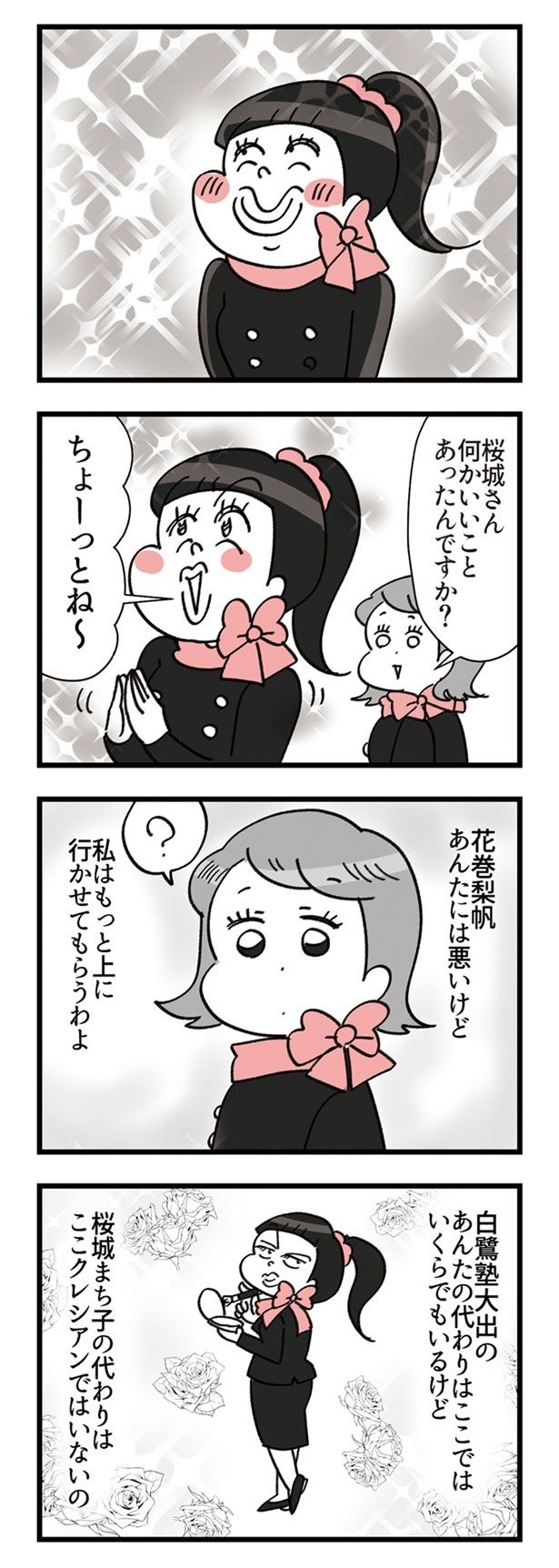 百貨店のコスメ売り場でビューティーアドバイザー(BA)として働く桜城まち子。常にトップの売上を誇る彼女についた異名は「カウンターのお嬢」。誰もがカリスマBAとして崇めている――と思っているのは本人だけで、周囲からは「押し売りのお嬢」と言われていた!? 売り場の同僚は助け合う仲間ではなく、売上を競う敵でしかない! 売り上げのためならなんだってする、憎めない悪女のデパコス職場コメディ『デパコスカウンターは今日も修羅場です ~BA下剋上物語~』。デパートで美しく微笑むBAたちの修羅場をお楽しみください。