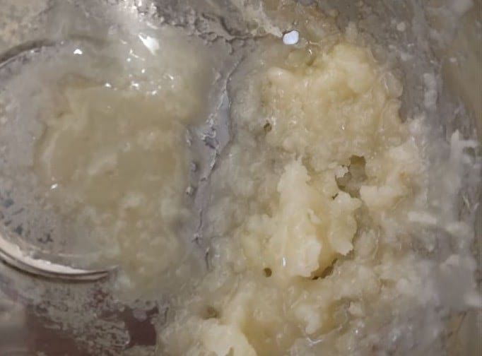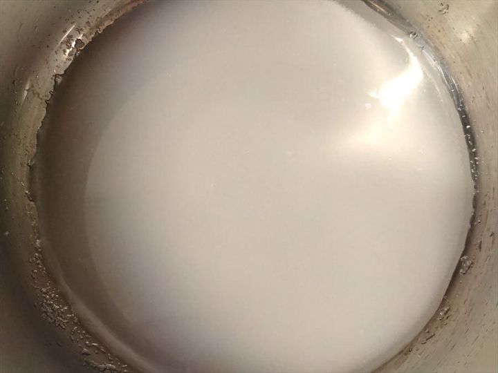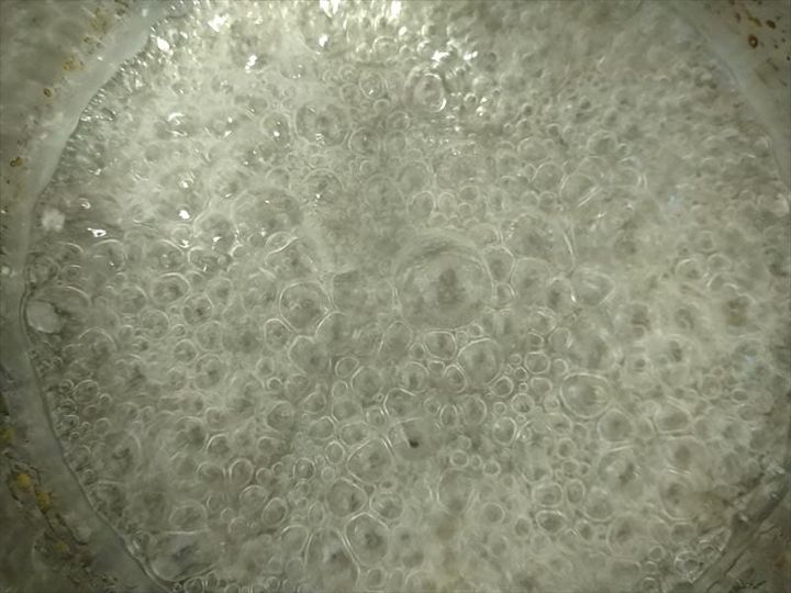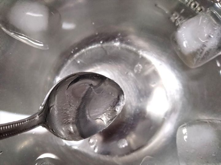 泡が大きくなり、粘り気が出てきたところで、スプーンで少しすくって氷水に落としてみます。