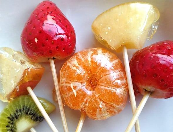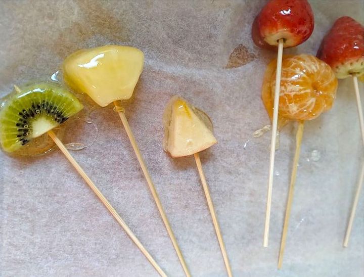 カットしたフルーツの表面からは水分が出やすく、飴が固まりにくいとのこと。