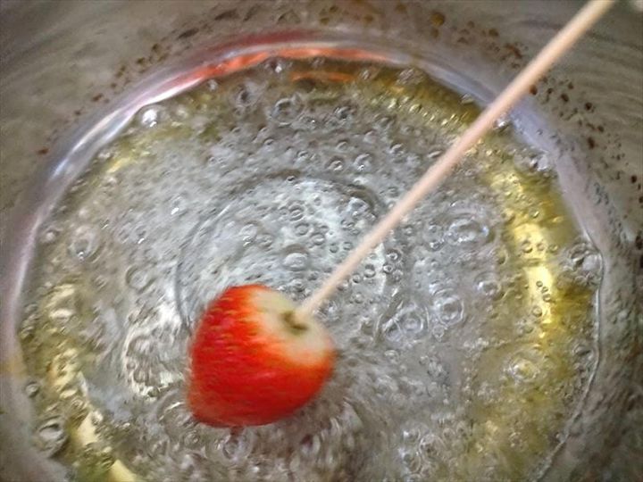 すぐに火を止めたら鍋を少し傾け、フルーツに水飴を絡めていきます。このとき、水飴が少しだけ黄色く色づいていました。