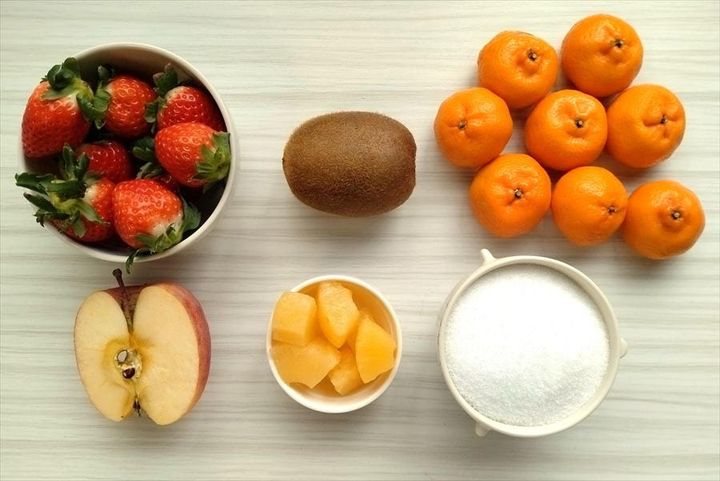 1. いちごはよく洗い、へたを取る。りんごは皮をよく洗い、芯を取って皮ごとひと口大に切る。キウイは皮を剥き、ひと口大に切る。パイナップルは、カットされてない場合はひと口大に切る。みかんは皮を剥く。
