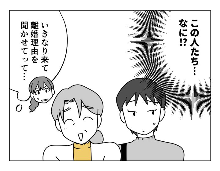 そりゃそうですよね。離婚理由なんて、たとえ友達であっても詳しく話せる相手は限られます。こんなよく知りもしない知人(仮)に、過去の離婚理由を聞かれても戸惑うだけです。しかも仕事中に押し掛けられて大迷惑! それに加えて、知人(仮)であろう女性が、自分と別れた男性と結婚しようとしている事実を知らされるなんて。この微妙な気持ちも、サナエさんたちには理解されないのかもしれません。