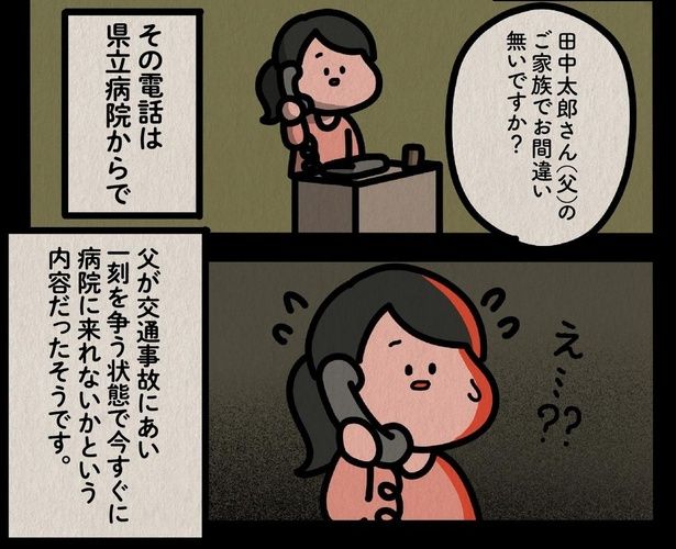 父親と男性が家を出てからまもなく、1本の電話が鳴り響く。相手は県立病院を名乗り、父親が交通事故に遭い危険な状態にあるため、至急来院してほしいとの連絡だった。母親は大急ぎで病院へ向かうも、受付からは「本日事故で搬送された方はおりません」と予想外の言葉が返ってきて……。