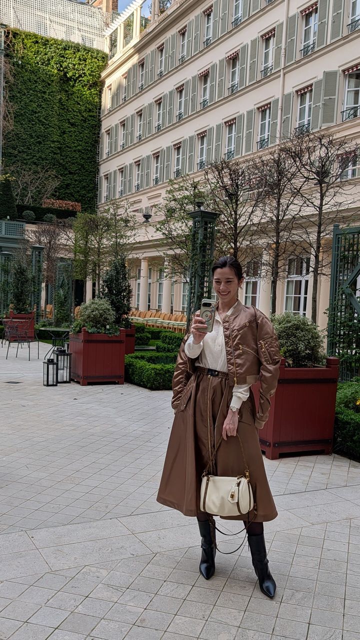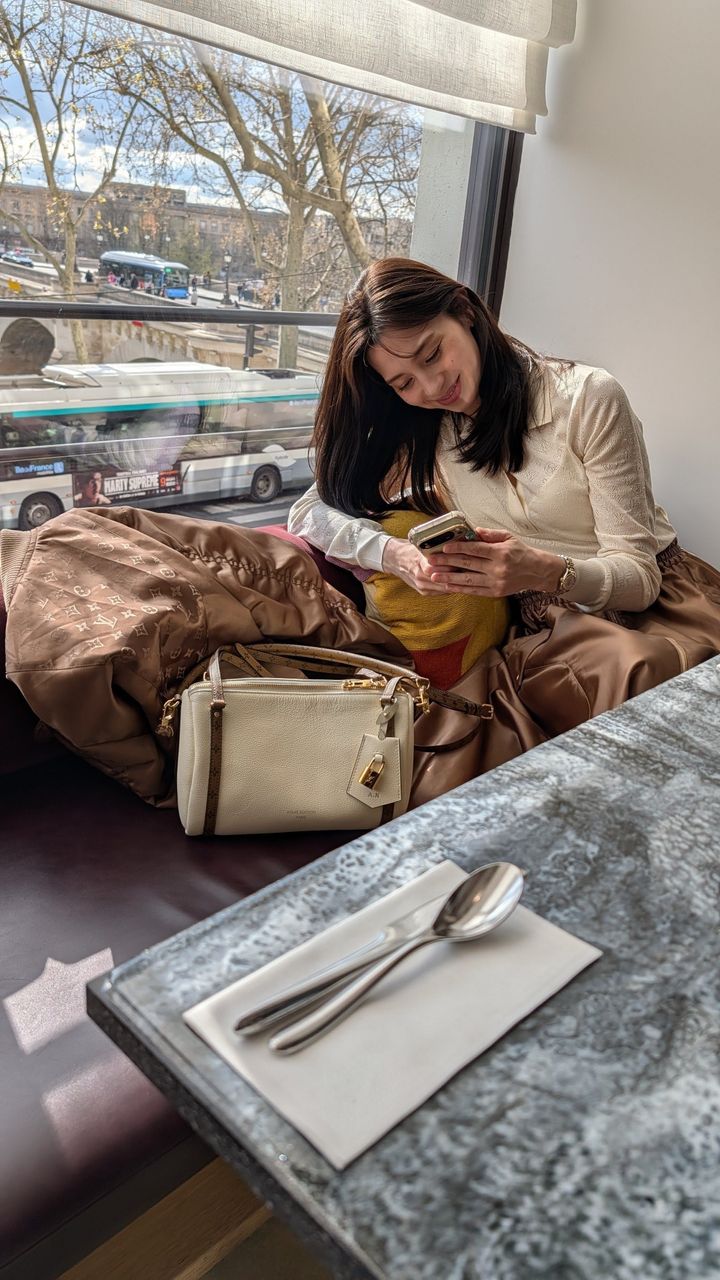 クリニャンクールを満喫した後は、セーヌ川沿いの眺めの良いレストランでランチ。光沢感のあるジャケットとスカートのセットアップに、バッグ“エクスプレス”を持ったスタイルで、パリらしい優雅なひとときを過ごしました。