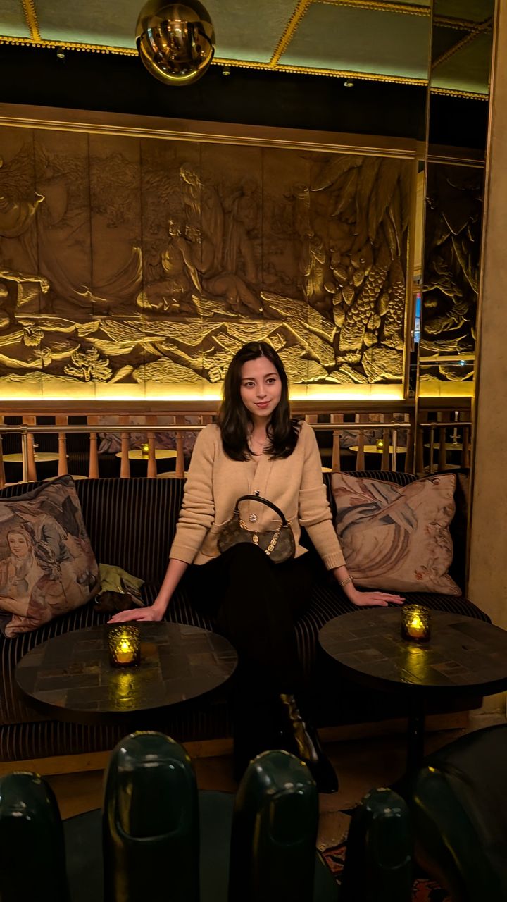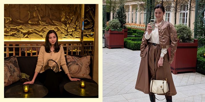 パリでは様々なスタイリングに挑戦! この日はシックな空間に合わせて、ベージュのカーディガンを主役にしたシンプルなコーデに。バッグは“キャッチー”を選んでエレガントな雰囲気にまとめました。
