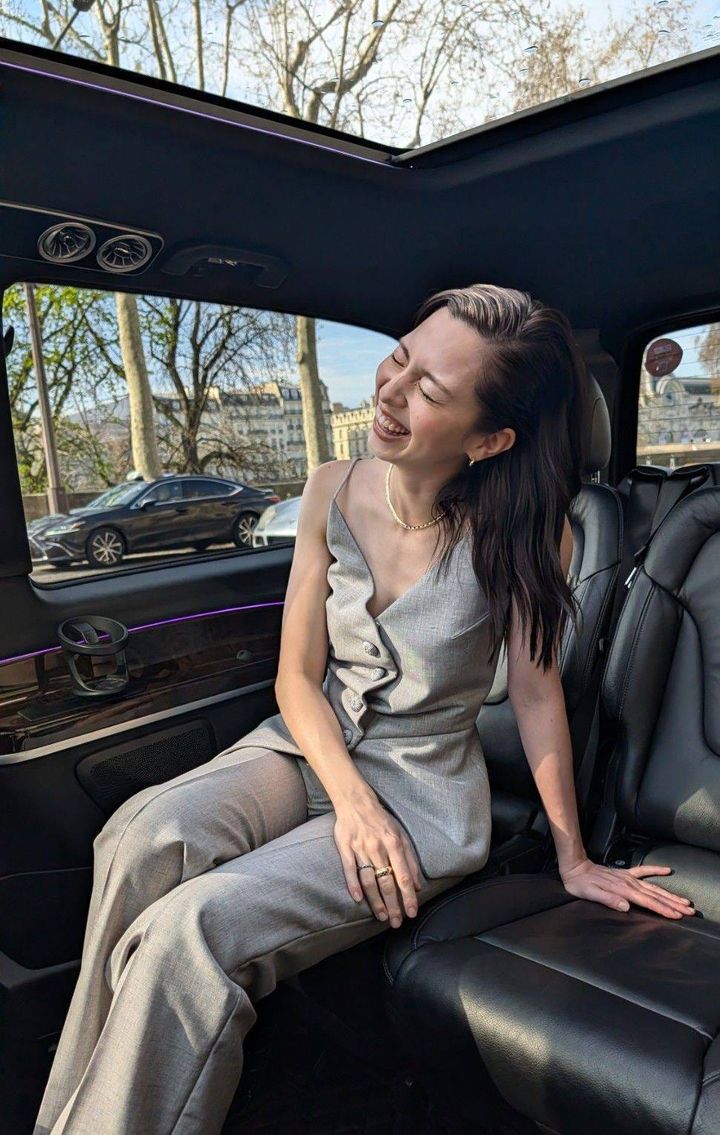 いよいよショー当日。準備を整え、会場であるルーヴル美術館へと車で向かいます。ショーへの期待感が高まる中、ファインジュエリーのクローズアップをセルフィーで撮影! メゾンのアイコニックなダミエ・モチーフにダイヤモンドをちりばめた存在感のあるネックレスに、スタイリッシュなピアスとリングをまとって。