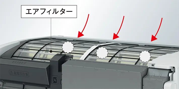 エアコンは上部から空気を吸い込み、内部で冷やしたり暖めたりした空気を部屋に送り出す仕組みです。
