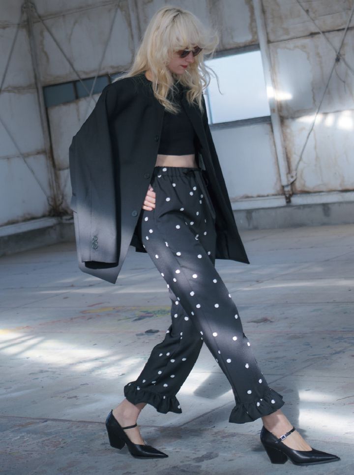 【POINT】+ジャケットで冷静さは保ったままフリルもあしらった陽気なドットに挑戦。よけいなだぼつきのないストレートで、シルエットはキレイめを意識。短め丈のトップスとヒールパンプスでメリハリと緊張感を補えば完璧。