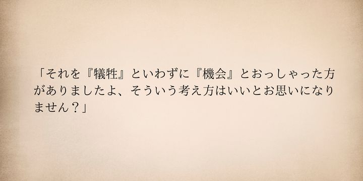 [『スウ姉さん』(河出文庫)P284]人から必要とされることほど有意義なことはない。それは「犠牲」ではなく、本当に生きがいのある生活をするための「機会」だという言葉に納得したスウが、音楽修業を切り上げ、家族のもとへ帰ることを告げたときのひと言。 Hearst Owned